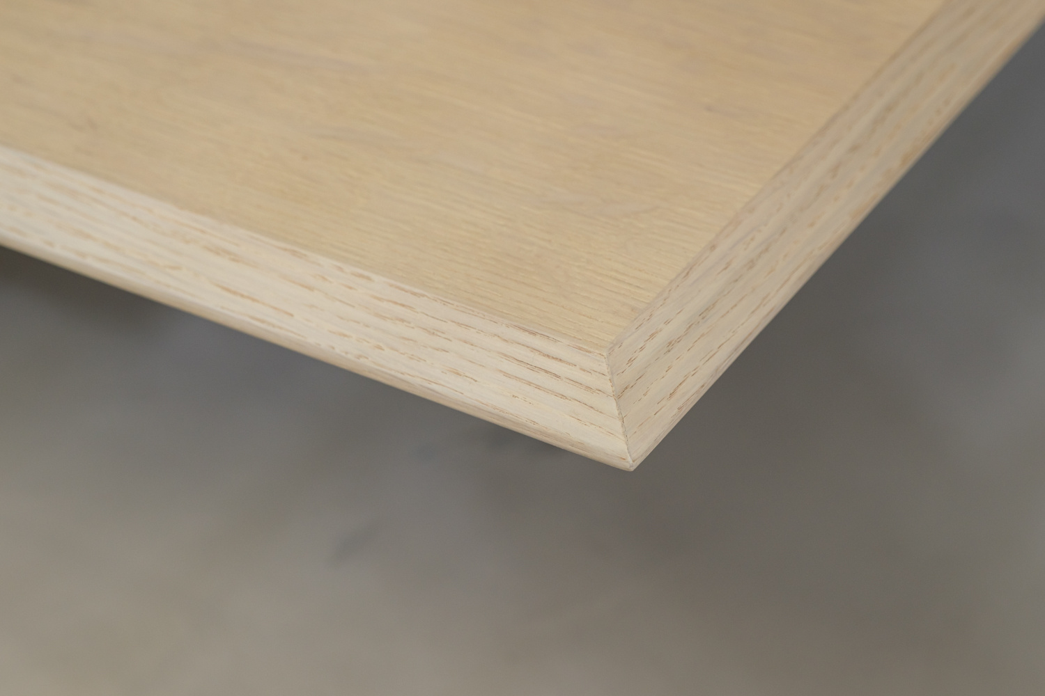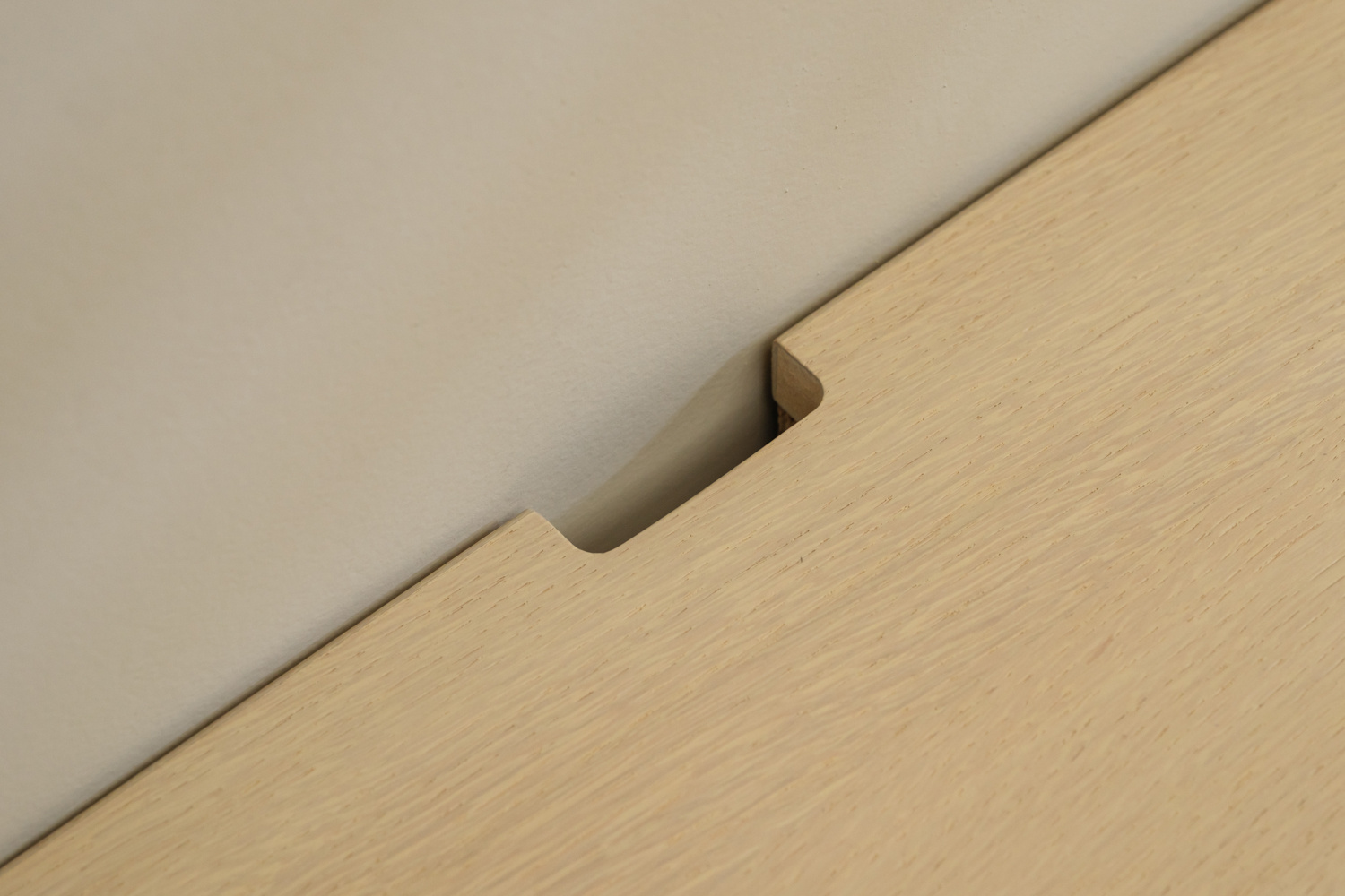 L180xD38xH30 cm. Uitsparing in het bovenblad (midden). Kleur mist oak.