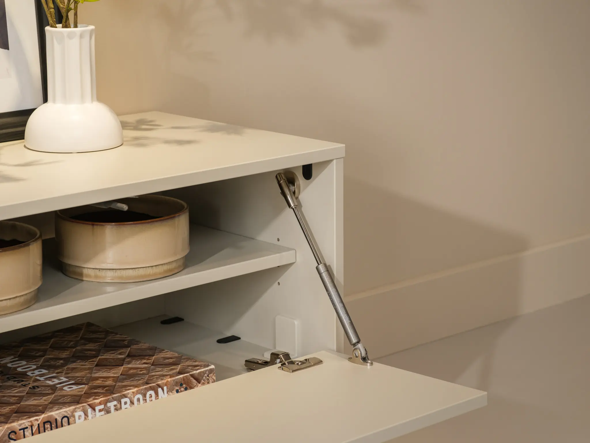 Het tv-meubel is greeploos uitgevoerd en voorzien van een valklep. Met het “push-to-open” systeem en de hoogwaardige gasveren openen de kleppen heel rustig door een simpele duw tegen het front. De kleur en het eiken blad geven het meubel een elegante en luxe uitstraling.